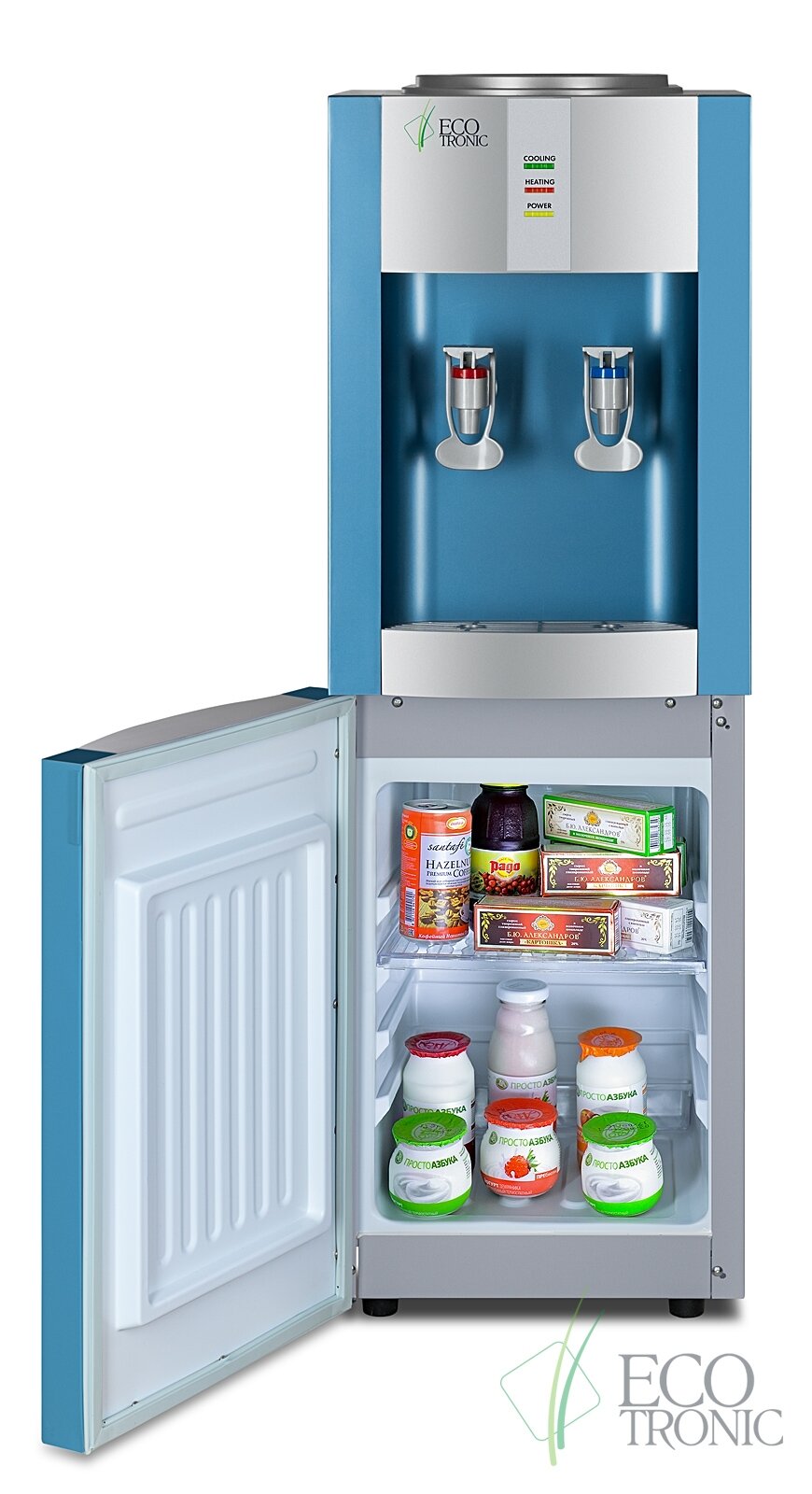 Напольный кулер Ecotronic H1-LF за час нагревает до 5 л горячей воды и охлаждает до 3 л воды. Холодильник объёмом 16 л подойдёт, чтобы хранить в нём бутерброды, снеки, соки.