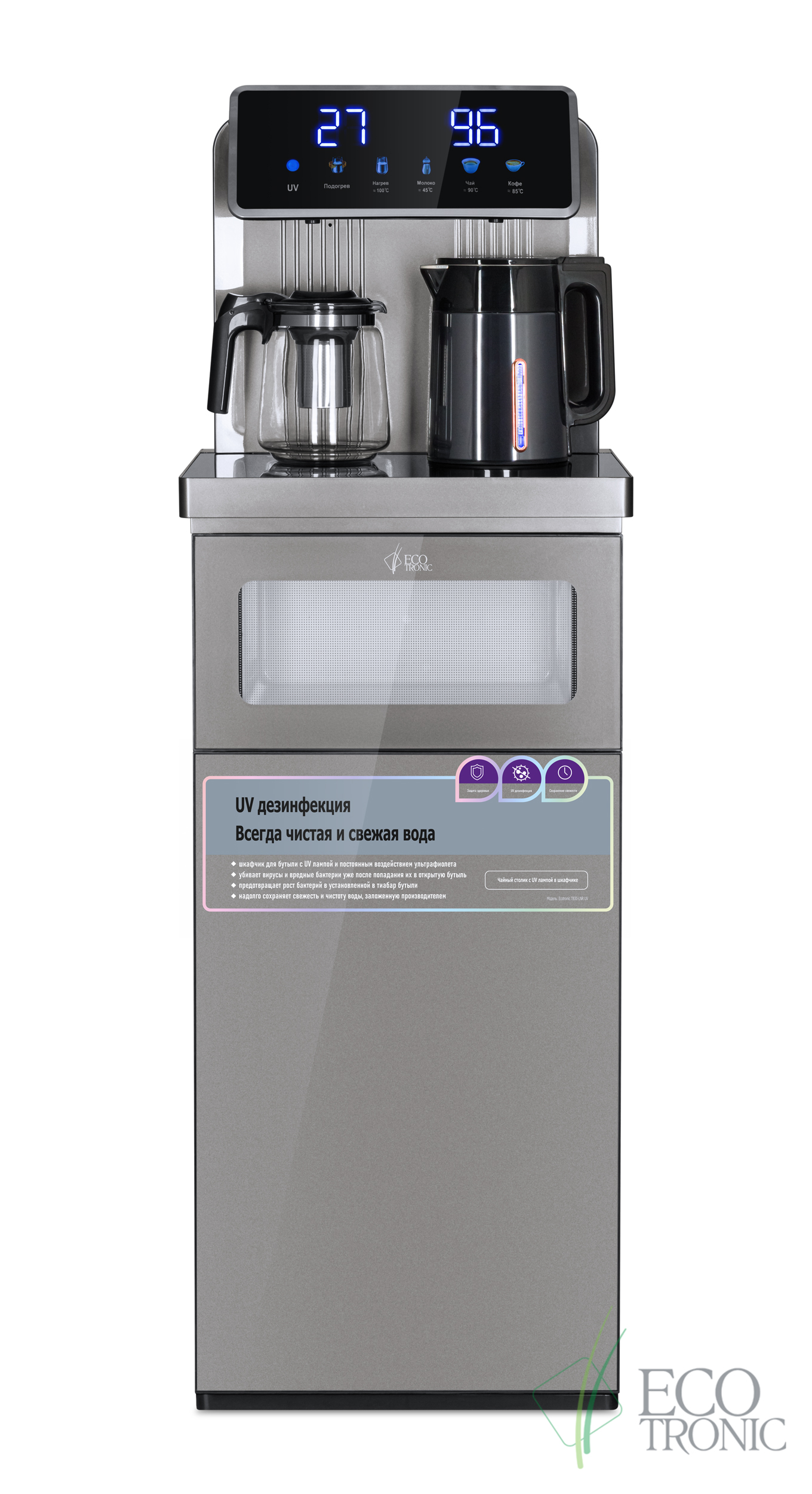 Большая и удобная панель управления с возможностью задать температуру нагрева (4 режима нагрева). Пульт дистанционного управления. Нижняя загрузка бутыли. Два чайника — для кипячения и заварочный. Чайник кипячения внутри выполнен из цельнотянутой нержавеющей стали, а снаружи имеет индикацию при нагревании.